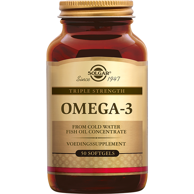 Solgar Omega-3 Triple Strength Visolie Softgels (50 stuks) bevat geconcentreerde visolie met omega-3 vetzuren EPA en DHA. EPA en DHA dragen bij tot de normale werking van het hart. DHA draagt bij aan het behoud van een normale hersenfunctie en een normaal gezichtsvermogen.