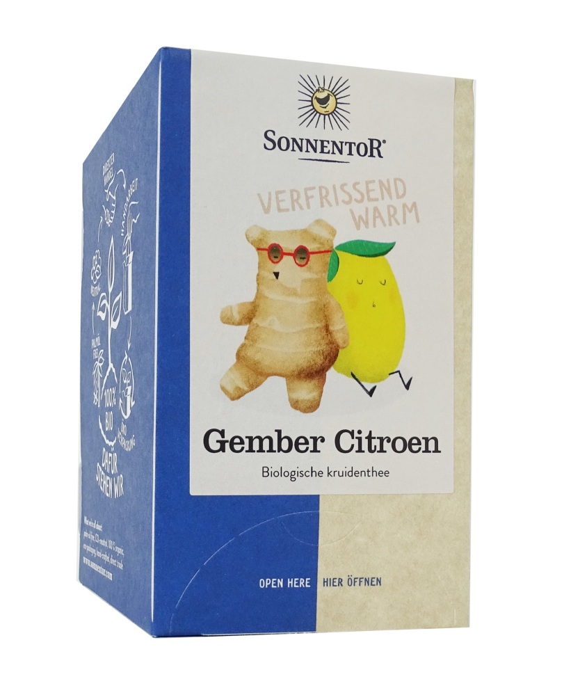 Sonnentor Gember Citroen Kruidentheezakjes is een geurige thee dat bestaat uit gedroogde gember en frisse citroengras met een fruitige smaak en een licht pittige afdronk. Supergezond, verfrissend en een geweldige hulp bij de spijsvertering.Sonnentor Gember Citroen