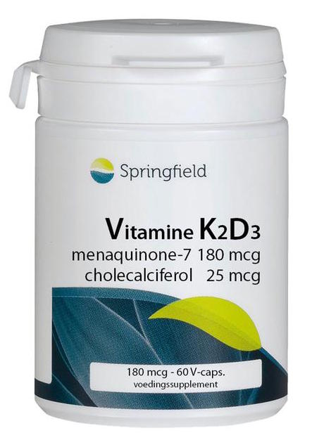 Springfield Vitamine K2D3 bevat een sterke combinatie, met hoge dosering van vitamine K2 (menaquinon-7 of MenaQ7) en vitamine D3 (cholecalciferol). Deze natuurlijke vorm van vitamine K2 is goed opneembaar, blijft langer in het lichaam en heeft een sterkere werking dan andere