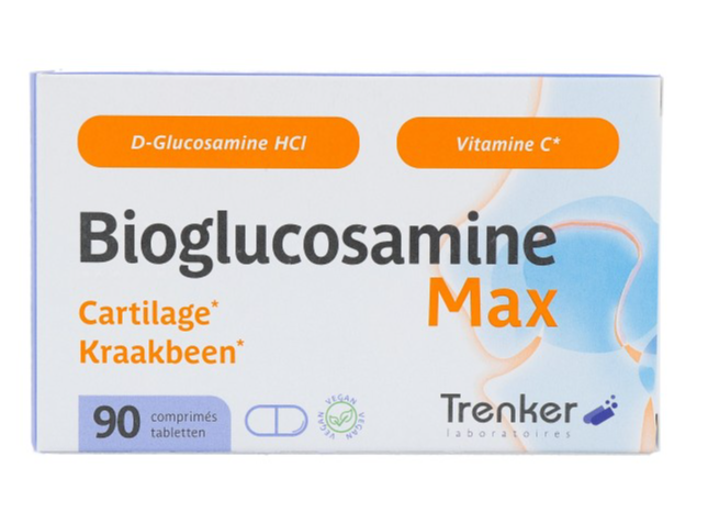 Trenker Bioglucosamine Max Tabletten is een voedingssupplement met 1500 mg glucosamine per tablet. Daarnaast bevat de formule 20 mg vitamine C dat bijdraagt aan de collageenvorming voor de werking van het kraakbeen.Trenker Bioglucosamine Max Tabletten:1500 mg glucosamine20