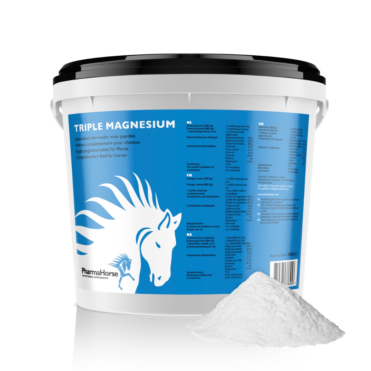 PharmaHorse Triple Magnesium bestaat uit drie organische Magnesiumbronnen: Magnesiumcitraat, Magnesiumlactaat en Magnesiummalaat. Magnesium draagt bij aan meerdere functies in het paardenlichaam. Zo heeft Magnesium een positieve invloed op de werking van het zenuwstelsel en is het mineraal goed voor de gemoedstoestand. Daarnaast is Magnesium goed voor het concentratievermogen en speelt het een rol bij het behouden van soepele spieren en voor het behoud van sterke botten.