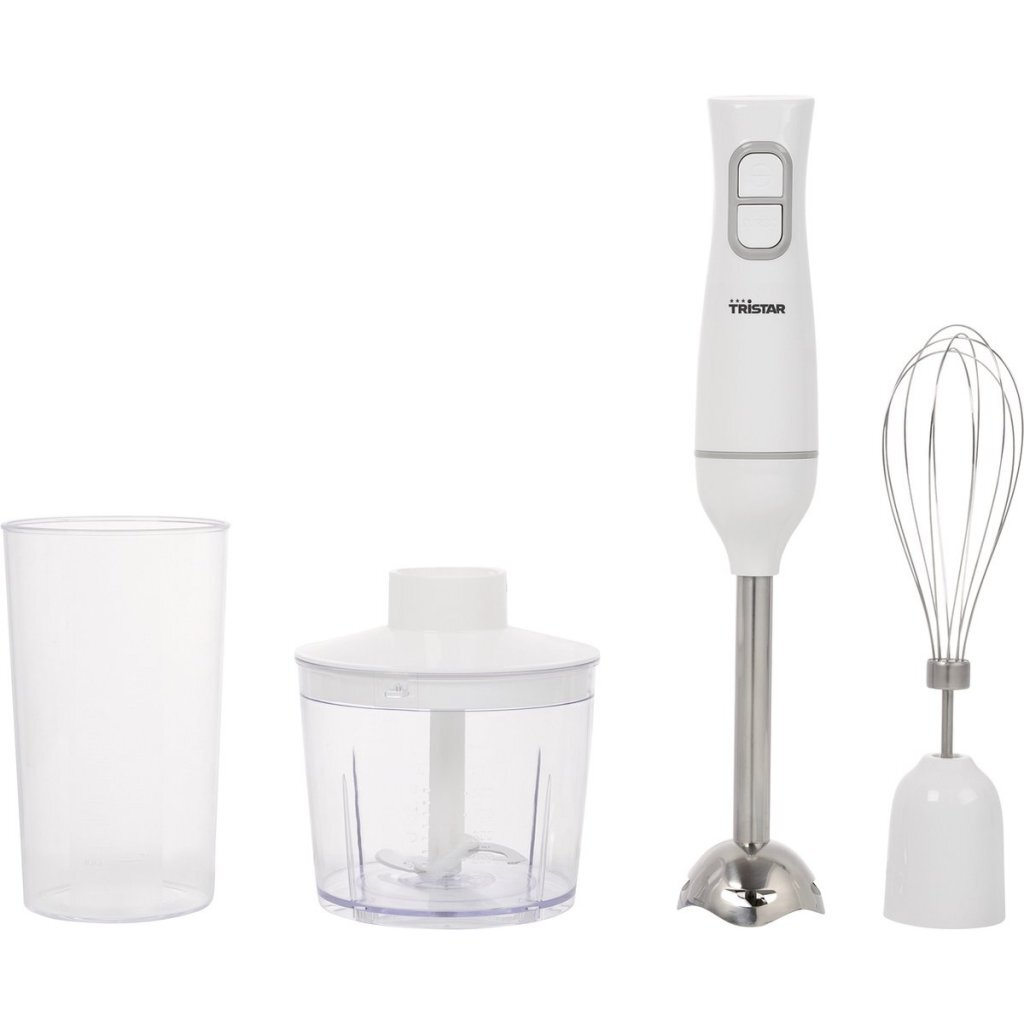 Met de Tristar MX-4881 staafmixerset creëer je in een handomdraai de heerlijkste verse soepen, sauzen, smoothies en nog veel meer! De compacte staafmixer is dankzij een vermogen van 350 watt een onmisbare toevoeging in je keuken en wordt geleverd met een garde, hakmolen en maatbeker.Hoog vermogen en praktisch designDe Tristar Staafmixerset beschikt over een sterk vermogen van 350 watt, waarmee je gemakkelijk en snel een heerlijke tomatensoep op tafel voor het hele gezin, of maak je een gezonde smoothie om even wat extra vitaminen binnen te krijgen. Hiernaast, kan je de turbofunctie gebruiken om ingrediënten extra glad en snel te pureren. De Tristar Staafmixerset beschikt over een ergonomische vorm, waardoor het apparaat comfortabel in de hand ligt. Bespaar jezelf de moeite van handmatig werk en laat de Tristar Staafmixerset het werk doen!Inclusief handige accessoiresPureer en mix allerlei ingrediënten in de handige meegeleverde maatbeker. De maatbeker heeft een capaciteit van 500 ml en is daarom zeer geschikt om sappen, soepen, sauzen en dips in te pureren. De hakmolen is voorzien van RVS messen, perfect voor het hakken van groenten.Eenvoudig te reinigenAlle onderdelen van de Tristar Staafmixerset zijn vaatwasserbestendig. Dit betekent veelzijdig gebruik zonder al het schoonmaakwerk naderhand.Staafmixerset geschikt voor soepen, smoothies en nog veel meer in een handomdraaiComfortabel te bedienen dankzij de ergonomische vorm van het handvatMakkelijk schoon te maken dankzij afneembare, roestvrij stalen staafInclusief handige maatbeker van 500 mlKleur: wit