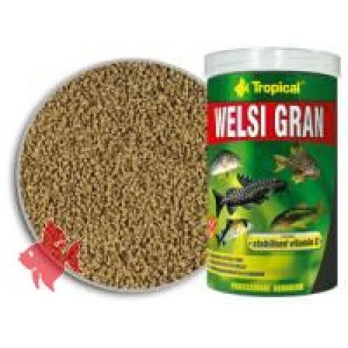 Welsi Granulaat is een multi-ingredient in de vorm van korrels voor aquarium vissen die zich voeden in de buurt van de bodem.