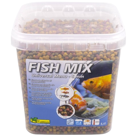 De Ubbink Fish Mix – Universal Menu 6 mm is perfect voor grotere vijvervissen die een grotere korrel nodig hebben. Het voer zorgt voor een goede gezondheid van je vissen doordat het alles bevat wat ze nodig hebben. De korrels zijn speciaal gemaakt voor vissen die voedsel van het wateroppervlak eten. Dit visvoer zorgt voor een gevarieerd dieet en helpt je vissen gezond te blijven. De verpakking van 5,4 liter is ideaal voor langere tijd en biedt je vissen een goede voeding.