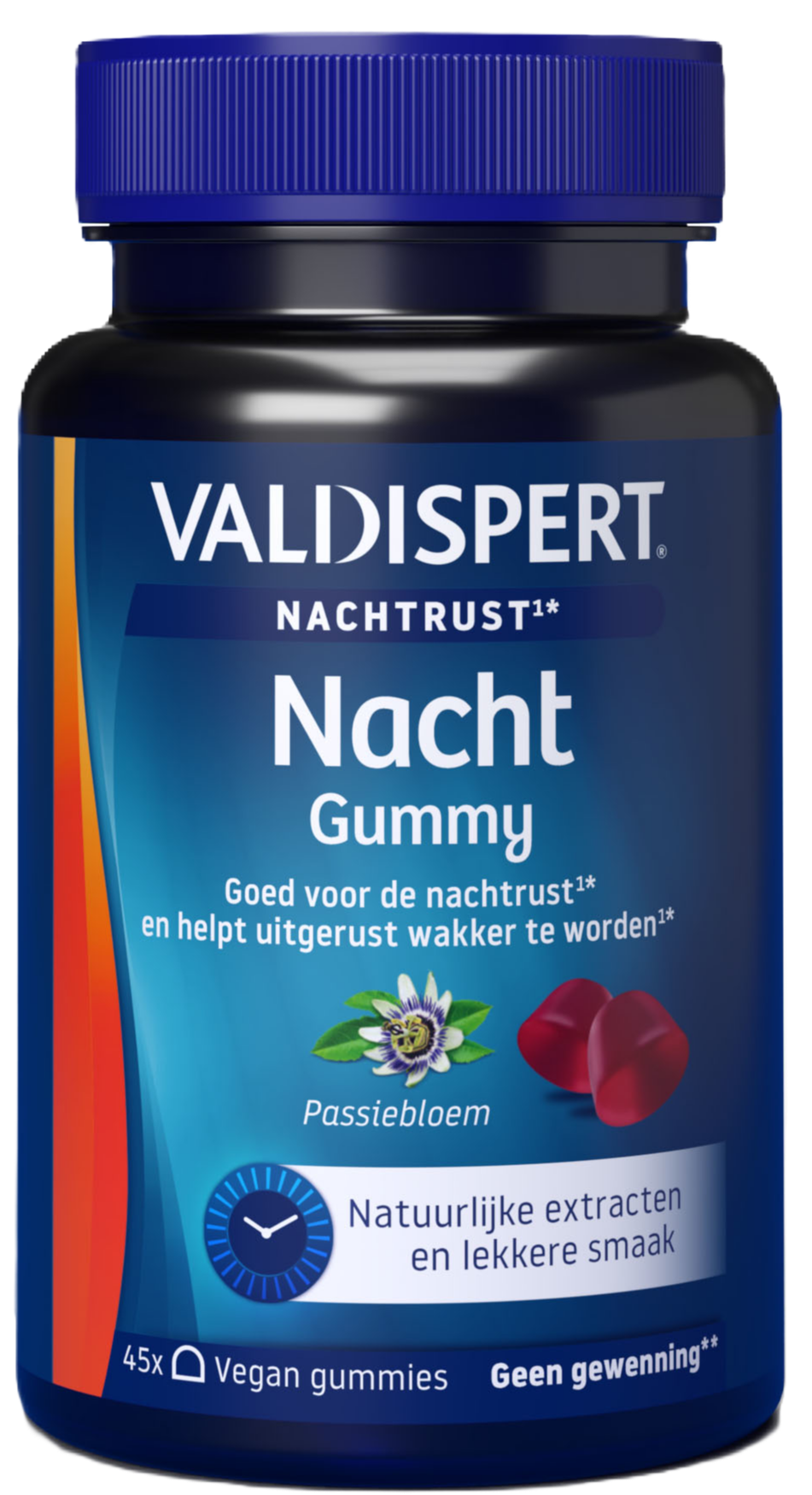 Valdispert Nacht Gummies (45st) zijn zachte kauwbare gummies met passiebloem, echinacea, vitamine C, HTP-5, griffonia extract en vlierbloesemextract.Valdispert Nacht Gummies:100% natuurlijke ingrediƫntenSmaakt naar zwarte bessen en kruidenNiet geschikt voor kinderen onder de