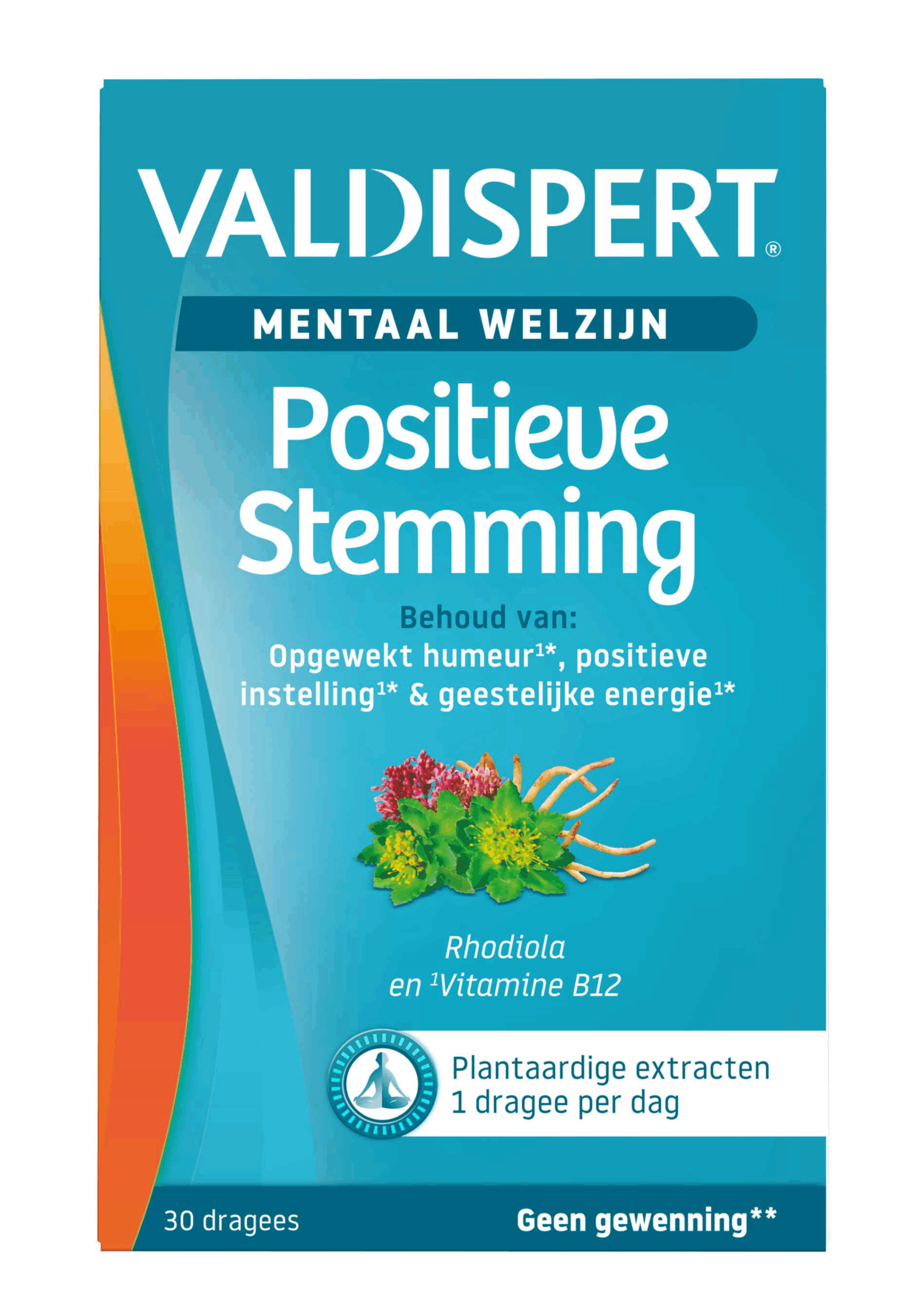 Valdispert Positieve Stemming Dragees (30st) is een mix van natuurlijke plantaardige extracten zoals Rhodiola, Valeriaanwortel, en B-vitaminen. Bevat geen kleurstoffen en is geschikt voor vegetariërs. Geen gewenning** Valdispert Positieve Stemming Dragees:Mix van