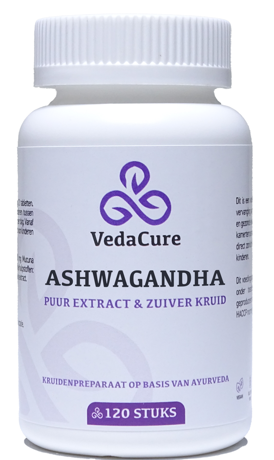 VedaCure Ashwagandha Tabletten (120 stuks) is een voedingssupplement. De tabletten hebben een unieke samenstelling met 5% withanolides geëxtraheerd uit de Ashwagandha wortel, gemengd met het pure kruid zodat het hele spectrum van werkzame stoffen van de hele plant