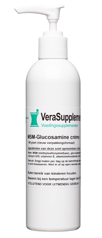 De VeraSupplements Creme MSM-Glucosamine is een geconcentreerde, snel intrekkende, met allantoïne verrijkte crème. Deze goed absorbeerbare crème heeft algeheel huidverzorgende eigenschappen. Hoe te gebruiken?Enige malen per dag op de betreffende plekken aanbrengen en licht