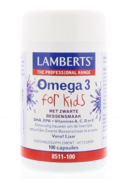 Lamberts Omega 3 for kids Vetzurenpreparaat Omega 3 for Kids is speciaal ontwikkeld voor kinderen van 3 jaar en ouder. Het kauwen op de zachte capsule geeft een uitbarsting van een heerlijke natuurlijke Zwarte Bessensmaak en levert essentiële Omega 3 vetzuren naast de Vitaminen A, C, D en E.