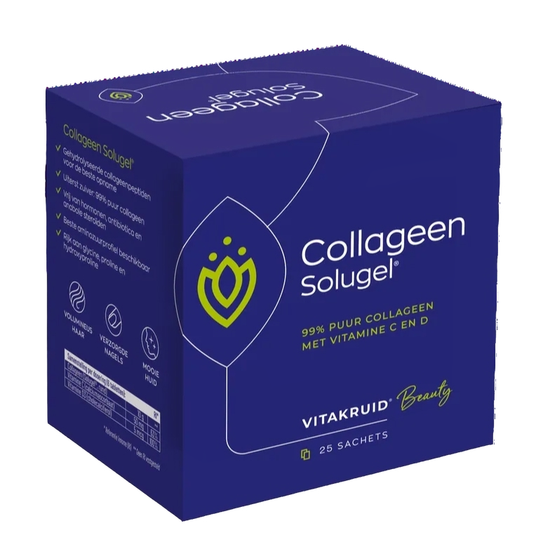 Vitakruid Collageen Solugel Sachets (25 stuks) is een voedingssupplement in handige sachetsvorm. Dit product bevat Solugel collageen peptides van rundoorsprong, verrijkt met vitamine C en D3. De sachets zijn ideaal voor gebruik onderweg of vakanties, waarbij u dezelfde