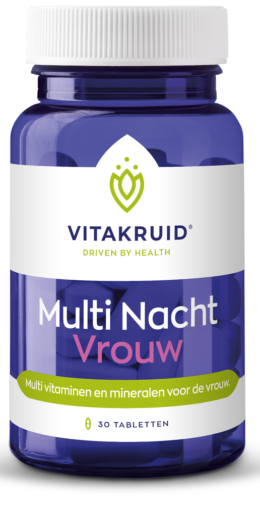 Vitakruid Multi Nacht Vrouw (30 stuks) is een voedingssupplement op basis van vitamines en mineralen speciaal voor de vrouw. Na een drukke dag wilt u tijdens de nacht ontspannen en slapen. De Multi Nacht Vrouw bevat onder andere vitamine D, voor behoud van sterke botten en