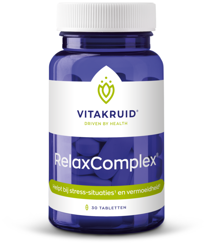 Vitakruid RelaxComplex® Tabletten (30 stuks) helpen bij alledaagse stress-situaties en vermoeidheid door de aanwezige folaat. Ook bevat dit voedingssupplement een formule dat ondersteuning biedt bij futloosheid en vermoeidheid (vitamine B12 en magnesium). Geschikt voor