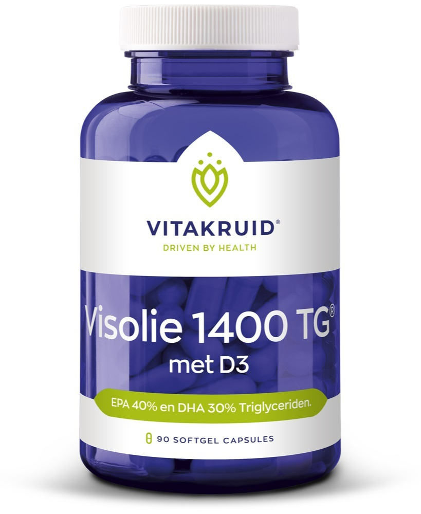 Vitakruid Visolie 1400 TG met D3 Capsules (60 stuks) bevat een zeer hoge concentratie omega-3 van >80%. Het bevat maar liefst 1200 mg omega 3-visolie per capsule. Met een zorgvuldig extractieproces is de EPA en DHA van de andere vetzuren gescheiden, waardoor de hoge