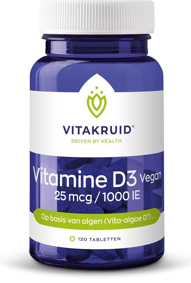 Vitakruid Vitamine D3 Vegan 25 Mcg Tabletten (120 stuks) zijn gemaakt uit algen in plaats van dierlijk wolvet en zijn daarom speciaal geschikt voor veganisten. Vitamine D draagt bij tot een normale werking van spieren en de instandhouding van gezonde botten en tanden. De