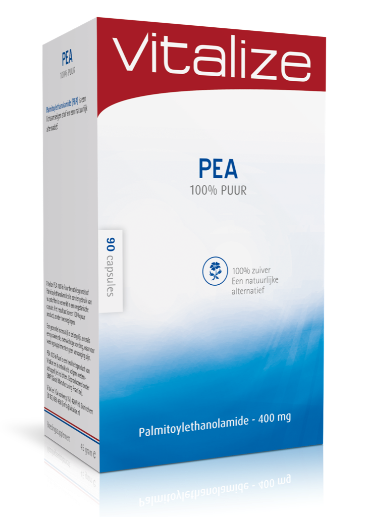 Vitalize PEA 100% Puur Capsules is een zuiver palmitoylmethanolamide supplement. PEA is een lichaamseigen stof die in de cel aangemaakt kan worden als reactie op bepaalde prikkels. De pure PEA capsules van Vitalize bevatten deze stof en kunnen goed opgenomen worden doordat