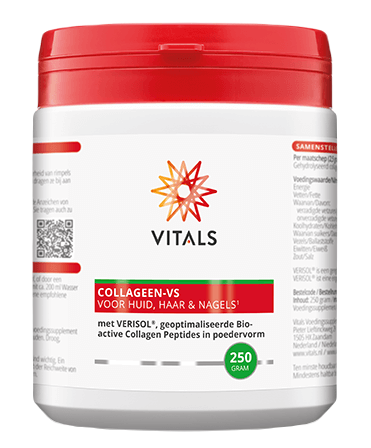 Vitals Collageen-VS Poeder bevat een pure vorm van bioactieve (runder) collageen peptiden onder de merknaam VERISOL®. Dit collageen poeder heeft al een goede werkzaamheid bij gebruik van 2,5 gram en heeft een aangename, neutrale smaak. VERISOL® is een van de meest gebruikte