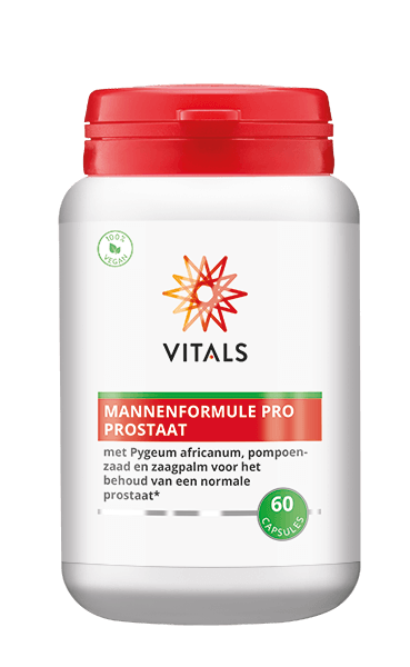 Vitals Mannenformule Pro Prostaat Capsules bevatten een formule speciaal voor mannen op basis van Pygeum africanum, pompoenzaad en zaagpalm voor het behoud van een normaal prostaat* en gezonde lagere urinewegen*. Daarbij bevat dit voedingssupplement bèta-sitosterol