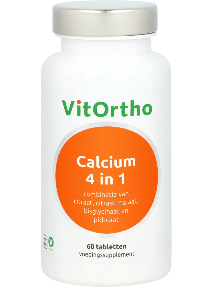 VitOrtho Calcium 4 in 1 Tabletten (60 stuks) bevat een combinatie van citraat, citraat malaat, bisglycinaat en pidolaat. Calcium ondersteunt de werking van de spieren en het zenuwstelsel. Ook is calcium goed voor het behoud van sterke botten en tanden en bevordert de