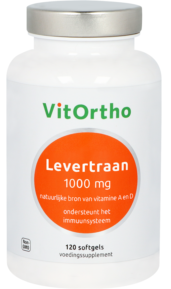 VitOrtho Levertraan 1000 mg Softgels bevat 1000 mg levertraan per capsule, gewonnen uit de lever van de vis. Het is rijk aan vitamine A en D en bevat bovendien grote hoeveelheden omega 3 vetzuren. – Vitamine D draagt bij aan de normale opname van calcium en fosfor.- Voor