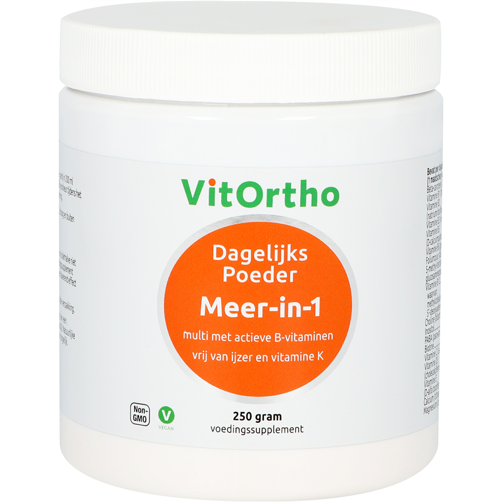 Vitortho Meer In 1 Dagelijks Poeder is multivitaminen en mineralen poeder met citrus-bosvruchtensmaak. Dit poeder lost eenvoudig op in water of vruchtensap, waardoor het makkelijk in te nemen is. Het bevat biologisch actieve vormen van vitamine B2, B6, foliumzuur en B12.