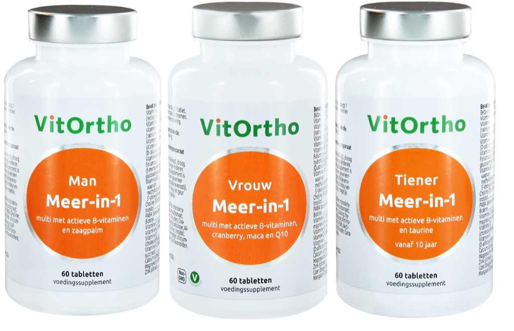 VitOrtho Meer-in-1 Man, Vrouw en Tiener Tabletten Combivoordeel bevat een combinatie van VitOrtho Meer-in-1 Man, Vrouw en Tiener voor het hele gezin. VitOrtho Meer-in-1 Man Een multivitamine/mineralenpreparaat afgestemd op de behoefte van de man. Het bevat biologisch actieve