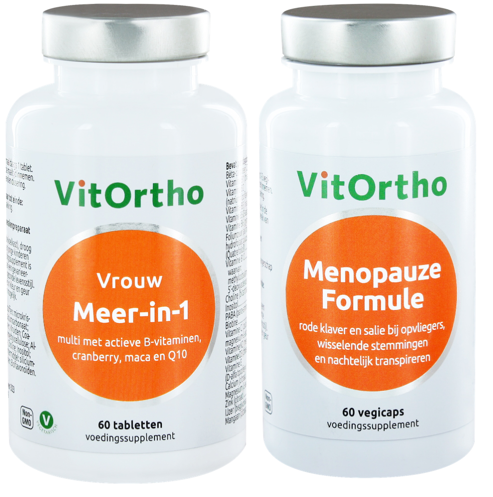 VitOrtho Meer-in-1 Vrouw Tabletten + Menopauze Formule Capsules bevat een combinatie van VitOrtho Meer In 1 Vrouw Tabletten 60ST en VitOrtho Menopauze Formule Capsules 60ST, speciaal ontwikkeld voor de vrouw. VitOrtho Meer-in-1 Vrouw TablettenEen