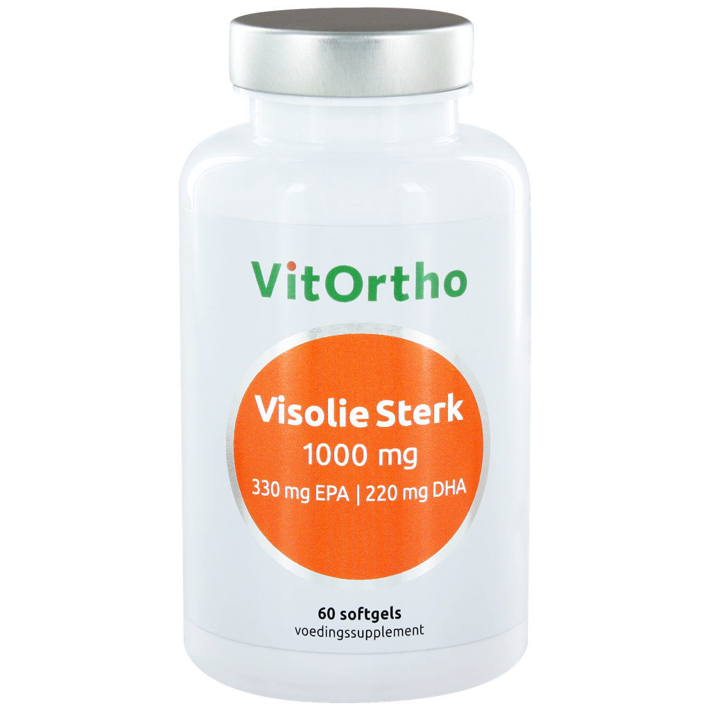VitOrtho Visolie Sterk 1000mg is een geconcentreerde visolie die 330 mg aan EPA (eicosapenthaeenzuur) en 220 mg aan DHA (docosahezaeenzuur) levert. Bij een minimale dagelijkse inname van 250 mg aan allebei de Omega 3 vetzuren, hebben EPA en DHA een gunstige werking op het