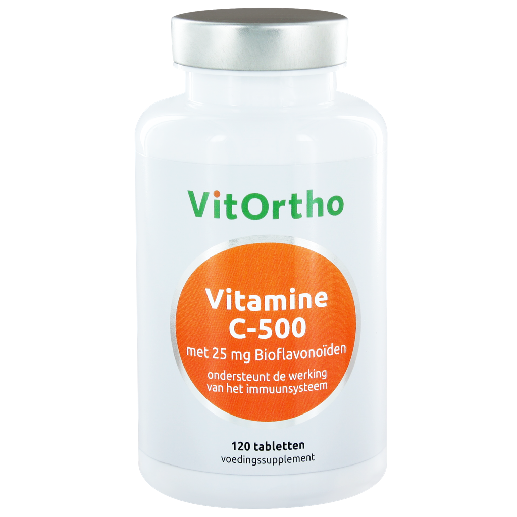 VitOrtho Vitamine C-500 met 25mg Bioflavonoïden is een vitaminepreparaat dat per tablet 625% van de aanbevolen dagelijkse hoeveelheid aan Vitamine C (L-ascorbinezuur) bevat. De formule is angevuld met 25 mg Citrus bioflavonoïden. Daarnaast is het ook geschikt voor