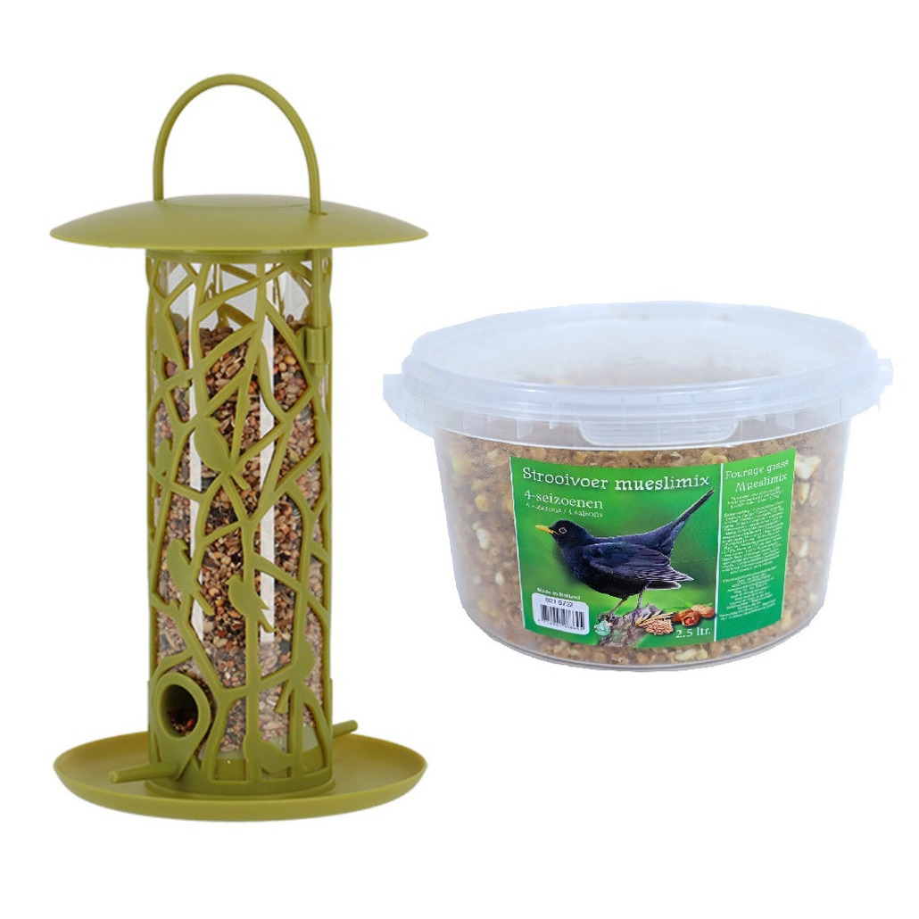 Vogel voedersilo met zitstokjes groen kunststof 27 cm inclusief 4-seizoenen mueslimix vogelvoer