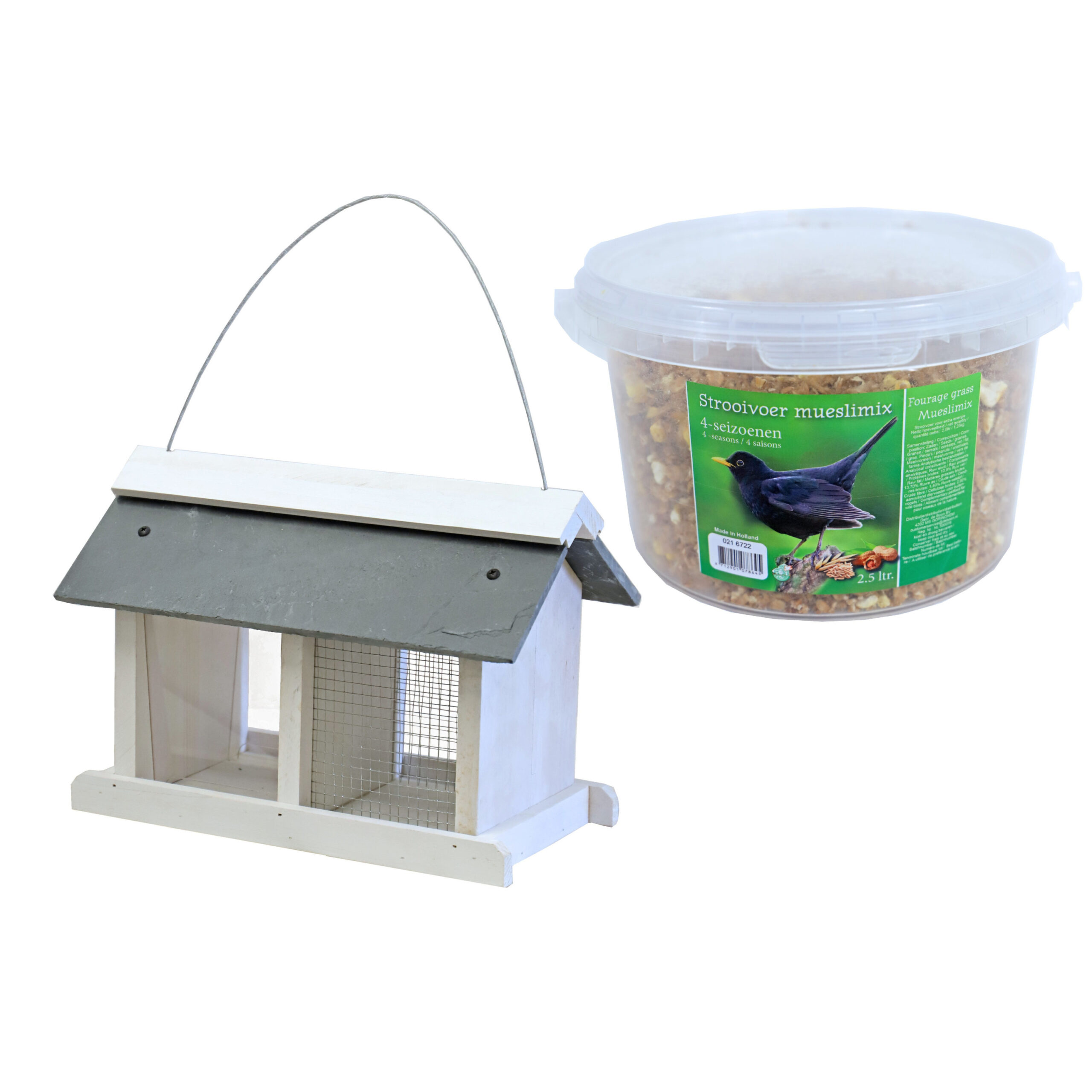 Vogelhuisje/voedersilo met twee vakken wit hout/leisteen 31 cm inclusief 4-seizoenen mueslimix vogelvoer. Dit hangende vogelvoer huisje heeft twee aparte vakken waarin u vogelvoer kan doen. Een helft is voorzien van plexiglas wat voor geschikt is voor strooivoer, de andere helft is voorzien van gaas wat deze kant geschikter maakt voor bijvoorbeeld noten. Het voer is bijzonder voedzaam en voorzien van alle benodigde prote?nen en vitaminen voor allerlei soorten tuinvogels. Afmeting: ca. 22 x 31 x 20 cm. Materiaal: hout, leisteen, metaal, plexiglas, gaas. , Dit artikel bestaat uit:, 1x Vogelvoer strooivoer mueslimix 4-seizoenen 2,5 liter, 1x Vogelhuisje/voedersilo met twee vakken wit hout/leisteen 31 cm