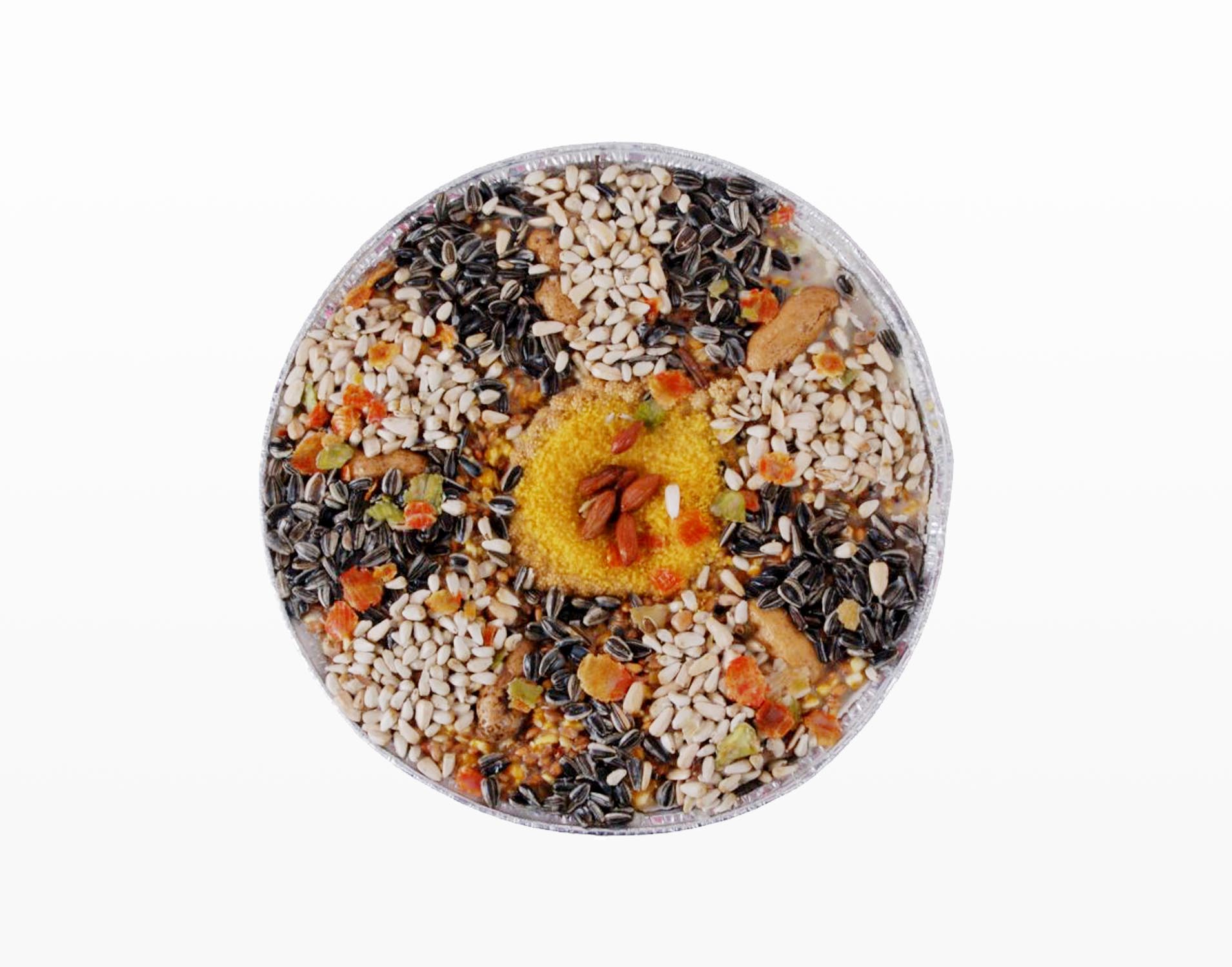 Deze vogelpizza zit vol met vitamines voor de vogels.