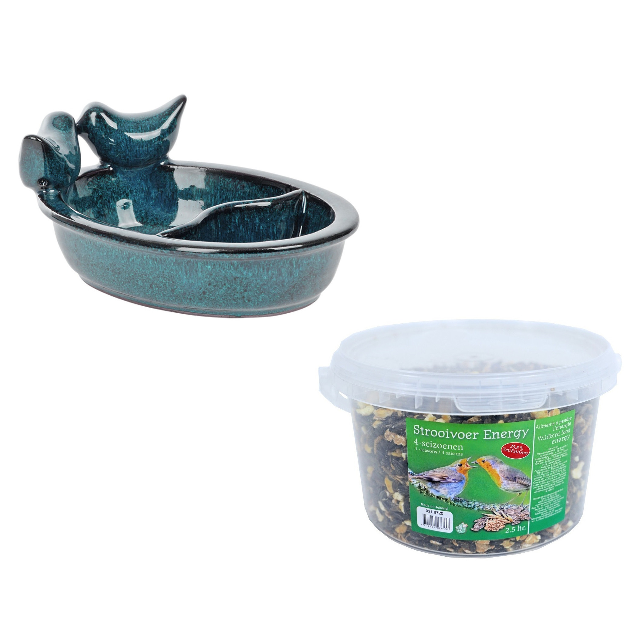Vogelvoeder- en drinkschaal blauw keramiek 21 cm inclusief 4-seizoenen energy vogelvoer. Deze vogelvoeder- en drinkschaal bevat twee vakken, een voor het vogelvoer met drainagegaatje en een voor het drinken. De schaal is gedecoreerd met twee kleine vogeltjes op de zijkant. Het voer is bijzonder voedzaam en voorzien van alle benodigde prote?nen en vitaminen voor allerlei soorten tuinvogels. De ingredi?nten van het strooivoer zijn zo samengesteld dat ze het hele jaar door aan vogels gevoerd kunnen worden. Afmeting: ca. 16 x 21 x 8 cm. Materiaal: keramiek. , Dit artikel bestaat uit:, 1x Vogelvoer strooivoer energy 4-seizoenen emmer 2,5 liter, 1x Vogelvoeder- en drinkschaal blauw keramiek 21 cm