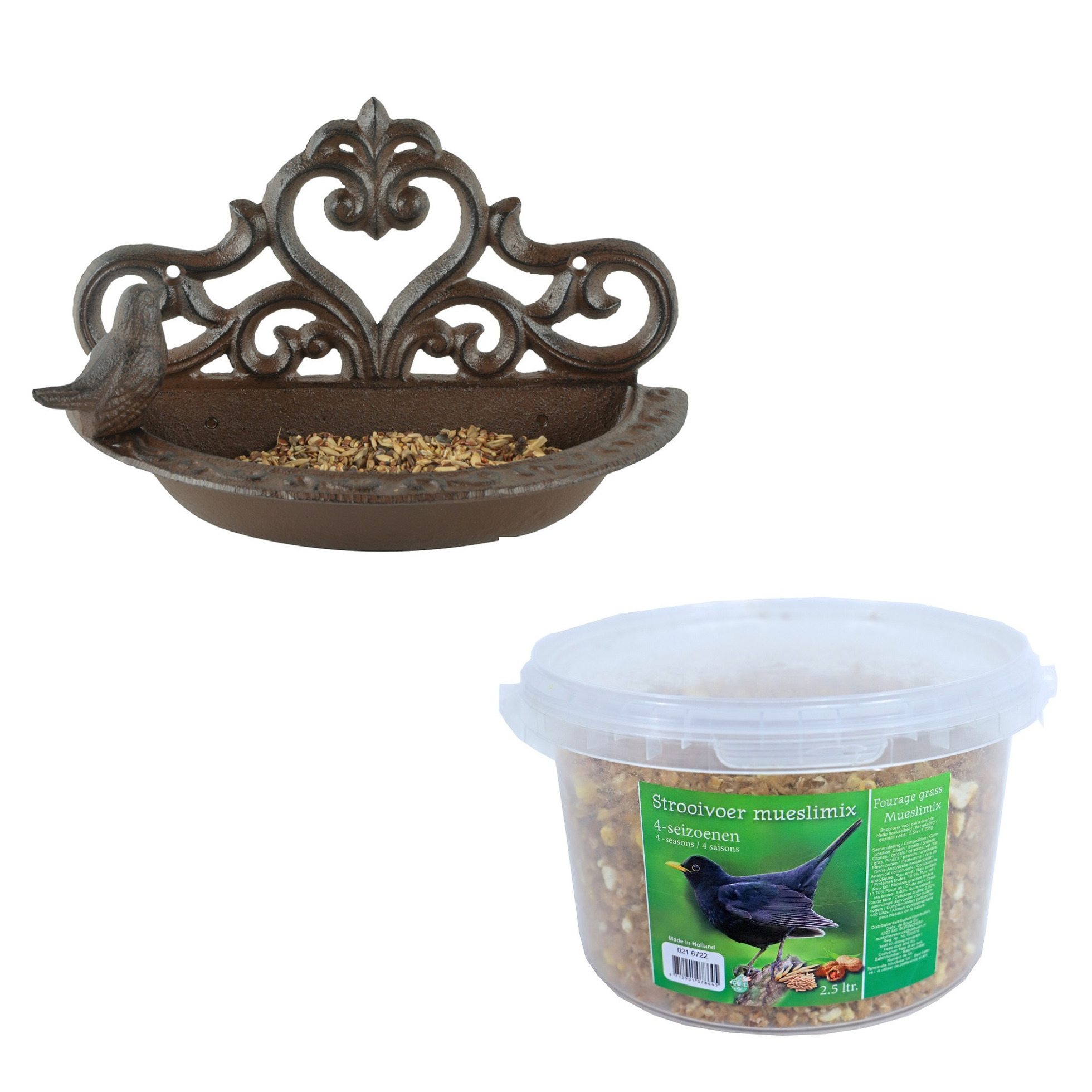 Wand vogel voederbak/drinkbak gietijzer 24 cm inclusief 4-seizoenen mueslimix vogelvoer. Gietijzeren wand schaal waar vogels uit kunnen eten en drinken of lekker in kunnen badderen. De voederschaal is gedecoreerd met een gietijzeren vogeltjes op de rand. Het voer is bijzonder voedzaam en voorzien van alle benodigde prote?nen en vitaminen voor allerlei soorten tuinvogels. De ingredi?nten van het strooivoer zijn zo samengesteld dat ze het hele jaar door aan vogels gevoerd kunnen worden. Afmeting: ca. 13 x 24 x 15 cm. Materiaal: gietijzer. , Dit artikel bestaat uit:, 1x Vogelvoer strooivoer mueslimix 4-seizoenen 2,5 liter, 1x Esschert Design Wand vogel voederbak/drinkbak – gietijzer – 24 cm – Vogelvoer – Vogelvoerbak