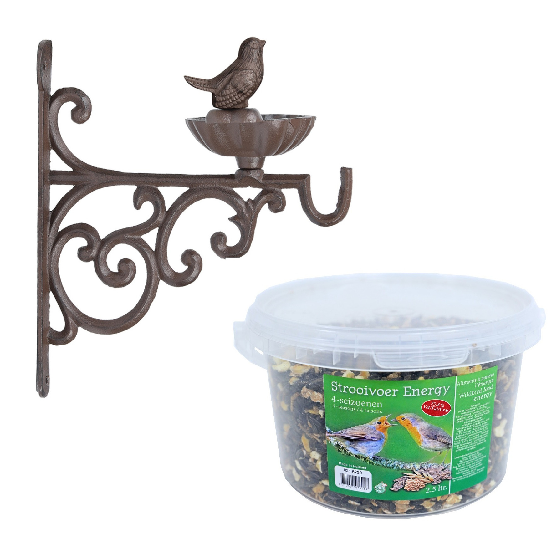 Wand vogel voederbak/drinkbak met haak gietijzer 19 cm inclusief 4-seizoenen energy vogelvoer. Aan de wand bevestigbare muurbeugel met gietijzeren schaal waar vogels uit kunnen eten en drinken of lekker in kunnen badderen. Naast de voederschaal bevat de muurbeugel aan het einde een haak waar u bijvoorbeeld een voedersilo of plantenbak aan kan hangen. De voederschaal is gedecoreerd met een gietijzeren vogeltjes op de rand. Het voer is bijzonder voedzaam en voorzien van alle benodigde prote?nen en vitaminen voor allerlei soorten tuinvogels. De ingredi?nten van het strooivoer zijn zo samengesteld dat ze het hele jaar door aan vogels gevoerd kunnen worden. Afmeting: ca. 19 x 14 x 22 cm. Materiaal: gietijzer. , Dit artikel bestaat uit:, 1x Vogelvoer strooivoer energy 4-seizoenen emmer 2,5 liter, 1x Esschert Design Vogelvoederbak – gietijzer – met haak – 19 cm – voederschaal – muurbeugel