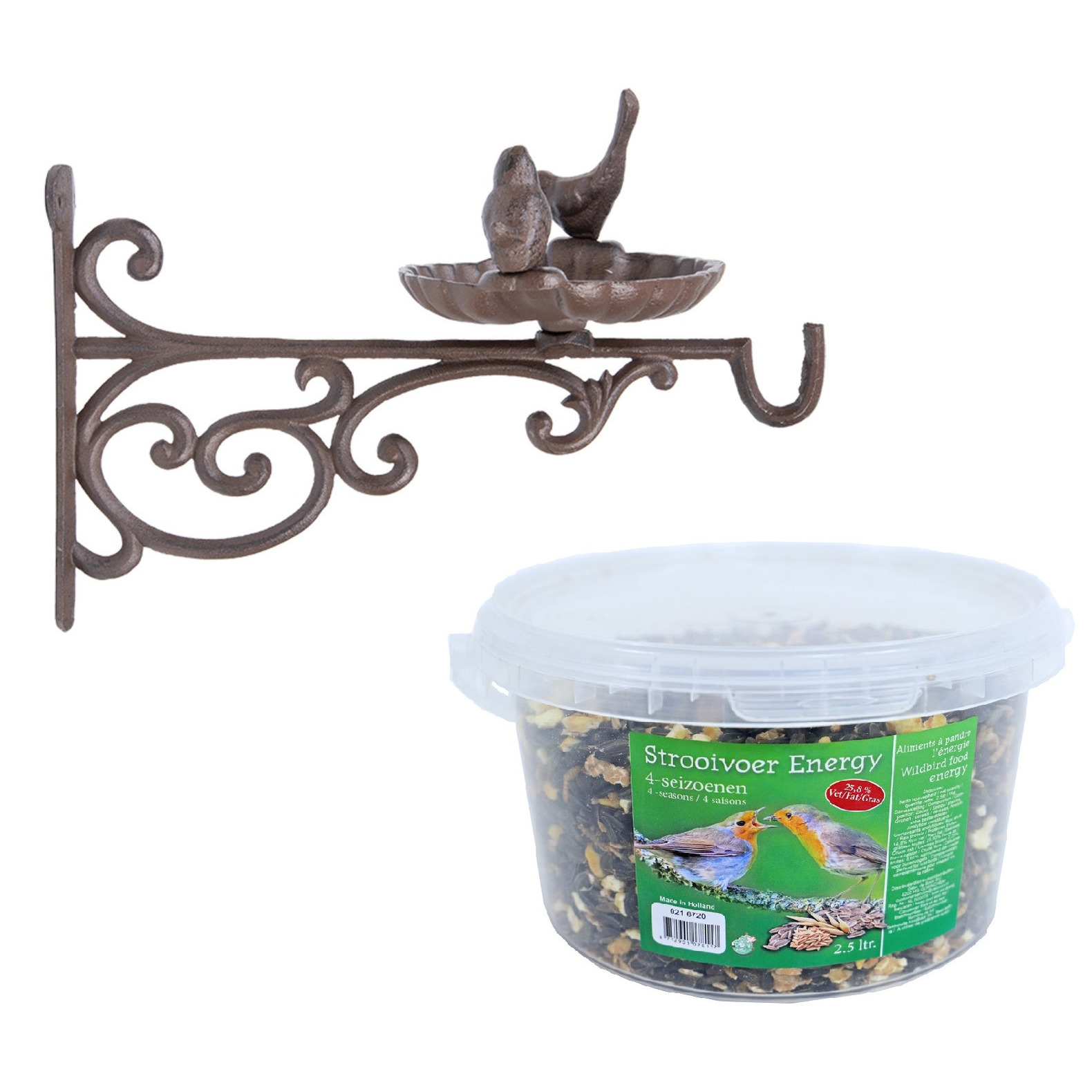 Wand vogel voederbak/drinkbak met haak gietijzer 35 cm inclusief 4-seizoenen energy vogelvoer. Aan de wand bevestigbare muurbeugel met gietijzeren schaal waar vogels uit kunnen eten en drinken of lekker in kunnen badderen. Naast de voederschaal bevat de muurbeugel aan het einde een haak waar u bijvoorbeeld een voedersilo of plantenbak aan kan hangen. De voederschaal is gedecoreerd met een gietijzeren vogeltjes op de rand. Het voer is bijzonder voedzaam en voorzien van alle benodigde prote?nen en vitaminen voor allerlei soorten tuinvogels. De ingredi?nten van het strooivoer zijn zo samengesteld dat ze het hele jaar door aan vogels gevoerd kunnen worden. Afmeting: ca. 35 x 24 x 25 cm. Materiaal: gietijzer. , Dit artikel bestaat uit:, 1x Vogelvoer strooivoer energy 4-seizoenen emmer 2,5 liter, 1x Wand vogel voederbak/drinkbak met haak gietijzer 35 cm