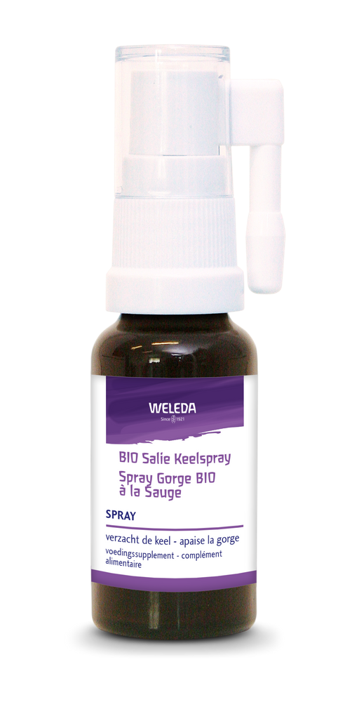 Weleda Salie Keelspray Bio verzacht de keel met biologische kamille en salie. Kamille heeft een verzachtende invloed en salie staat bekend om haar zuiverende eigenschappen. Dankzij het handige spraypompje is deze zuiver plantaardige en biologische keelspray goed en eenvoudig